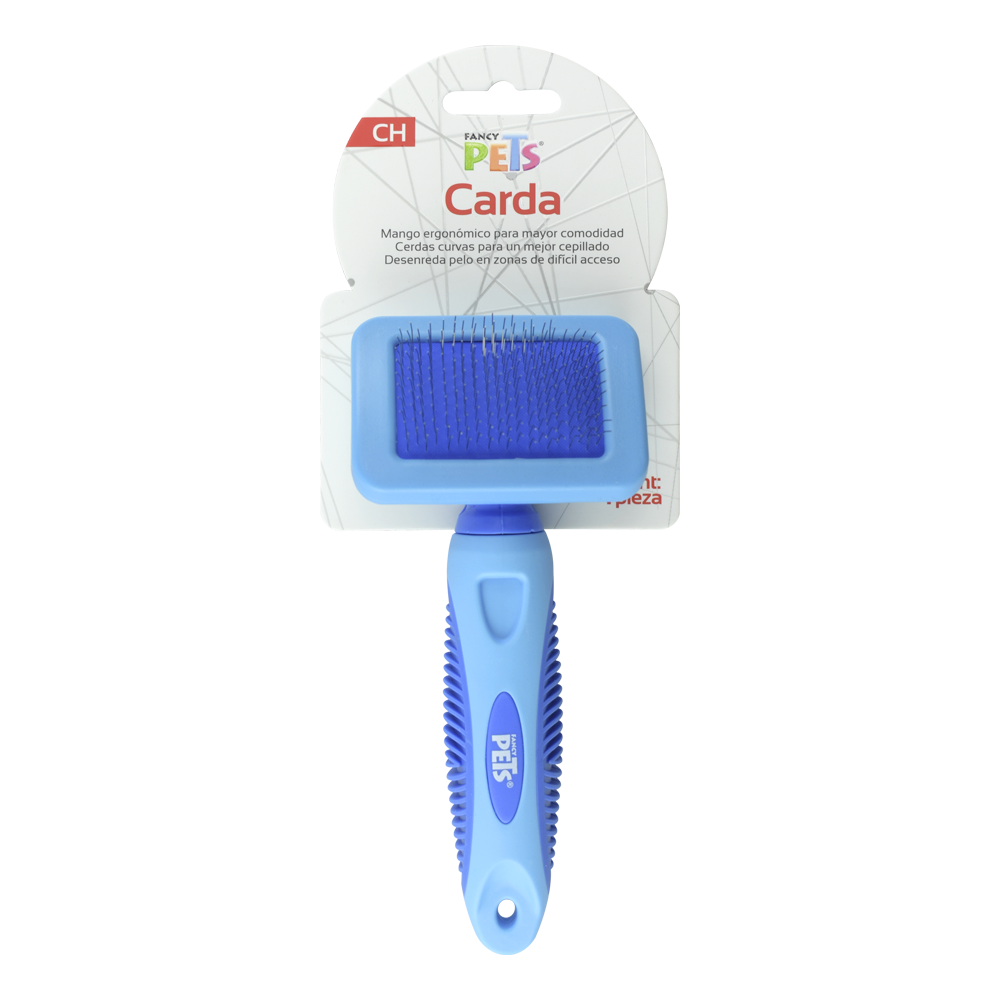 La carda de Fancy Pets es la herramienta ideal para cepillar los mantos medios y largos de los perros, sus pequeñas puas ingeniosamente distribuidas fácilita la tarea y permite eliminar cualquier objeto extraño y pelo muerto del manto. El cepillado estimula la producción de aceites naturales protectores en la piel de su perro.Beneficios: